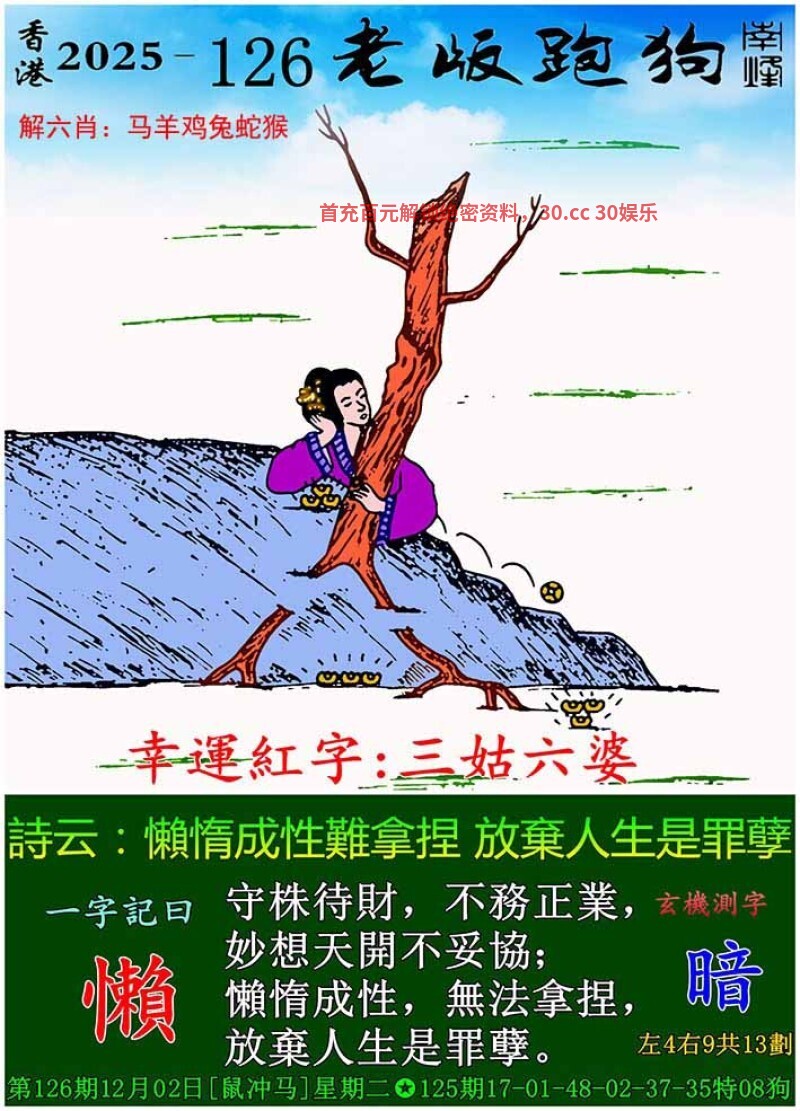 解析:今期生肖看三五,马马虎虎来骗人,35羊,明肖马虎,牛狗鸡马本期有,还有三二四零中,明肖牛狗鸡马,四六等于二十四,好码就从中间出,24马,三一四二是何肖,不管三七二十一,31猪,42鼠,21鸡。
